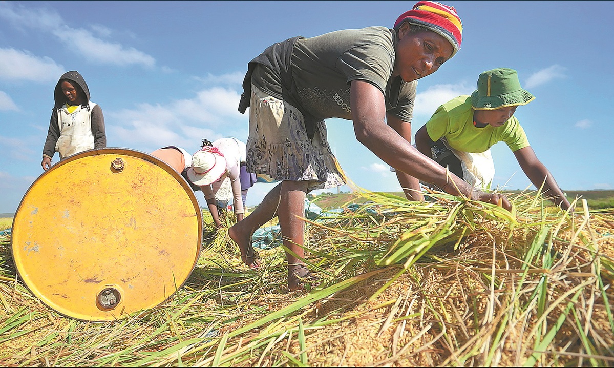 Farmers harvest hybrid rice at a demonstration plot grown with Chinese researchers' support in Madagascar in April. GU PENGBO/FOR CHINA DAILY