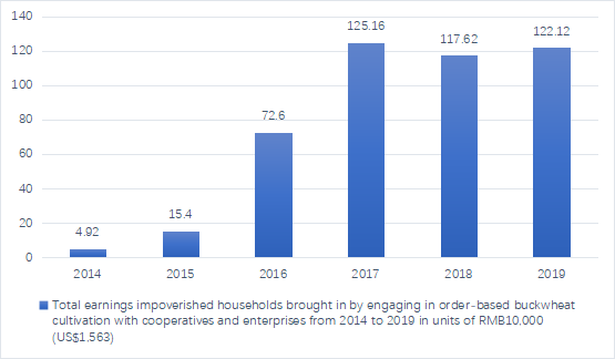 Local buckwheat farming, especially order-based cultivation, has yielded favourable and sustainable changes for Hure residents. In 2019, buckwheat cultivation enabled 17,583 residents living in 6,077 impoverished households to increase their incomes by a combined total of RMB2.43 million (US$379,688), or an average of RMB400 (US$63) per household. Buckwheat cultivation has also enabled 2,950 impoverished farmer and herder households working for food, tourism and culture businesses within the buckwheat industry to increase their incomes by a combined total of RMB59 million (US$9.22 million), or an average of RMB20,000 (US$3,125) per household.