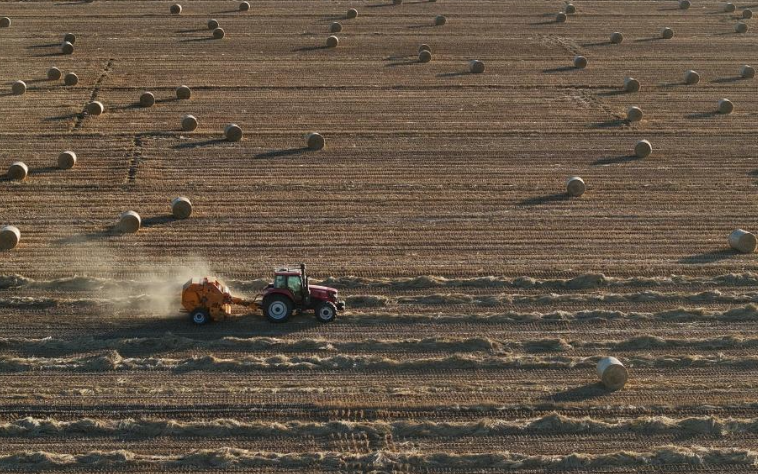 Collecte et pressage de la paille pour l’alimentation du bétail et la production d’électricité à partir de biomasse à la Huitième Ferme, district de Caofeidian, ville de Tangshan, province du Hebei. [Photo de Yang Shiyao/Xinhua]