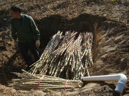 Dig the pits or caves big or small depending on how many stems you have, bigger for more stems and smaller for fewer. But pits and caves need different care. You have to dig new storage pits and clean them thoroughly every year to get rid of old dirt and germs. Storage caves, though, can be used year after year once they are dug properly. Even so, you need to disinfect them fully before each storage season. You can use a disinfectant or just let sunlight shine into the cave—either way kills hidden pests and germs.