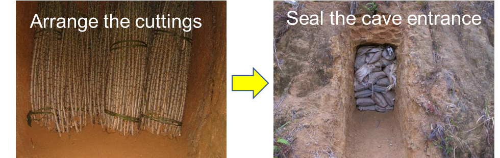 The first key step to storing cassava stem cuttings is picking the right spot and digging storage pits or caves (see Figure 1). The spot needs to check three boxes: it should be protected from strong winds, which keeps the stems from drying out too fast; it should get some sunlight, since sunlight keeps the storage area’s temperature steady and kills harmful germs; it also needs good drainage, so water does not pool up and make the stems rot.