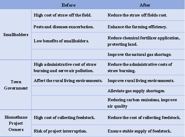 L’efficacité du mode « cycle alimentation-gaz » peut être illustrée du point de vue des petits exploitants, du gouvernement municipal/comité villageois, et des propriétaires de projets de biométhane, la version brève est référée au Tableau 1.