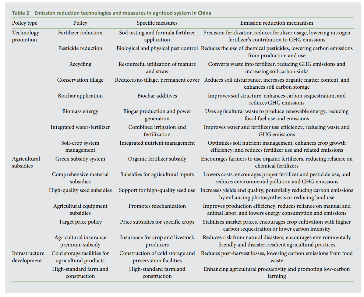 Notamment, les réformes du système de subventions agricoles de la Chine mettent l’accent sur les objectifs verts (Tableau 2). Les subventions pour les engrais chimiques, les intrants agricoles et les semences ont été redirigées vers le soutien aux engrais organiques, aux machines économes en énergie et à la protection de la fertilité des terres agricoles. Les investissements dans la construction de terres agricoles à haut standard ont amélioré la productivité tout en réduisant la dépendance aux intrants chimiques comme les engrais et les pesticides, réduisant davantage les émissions de carbone. De plus, les installations de stockage frigorifique et de conservation ont réduit les pertes et gaspillages alimentaires, contribuant à la réduction des émissions de la chaîne d’approvisionnement.