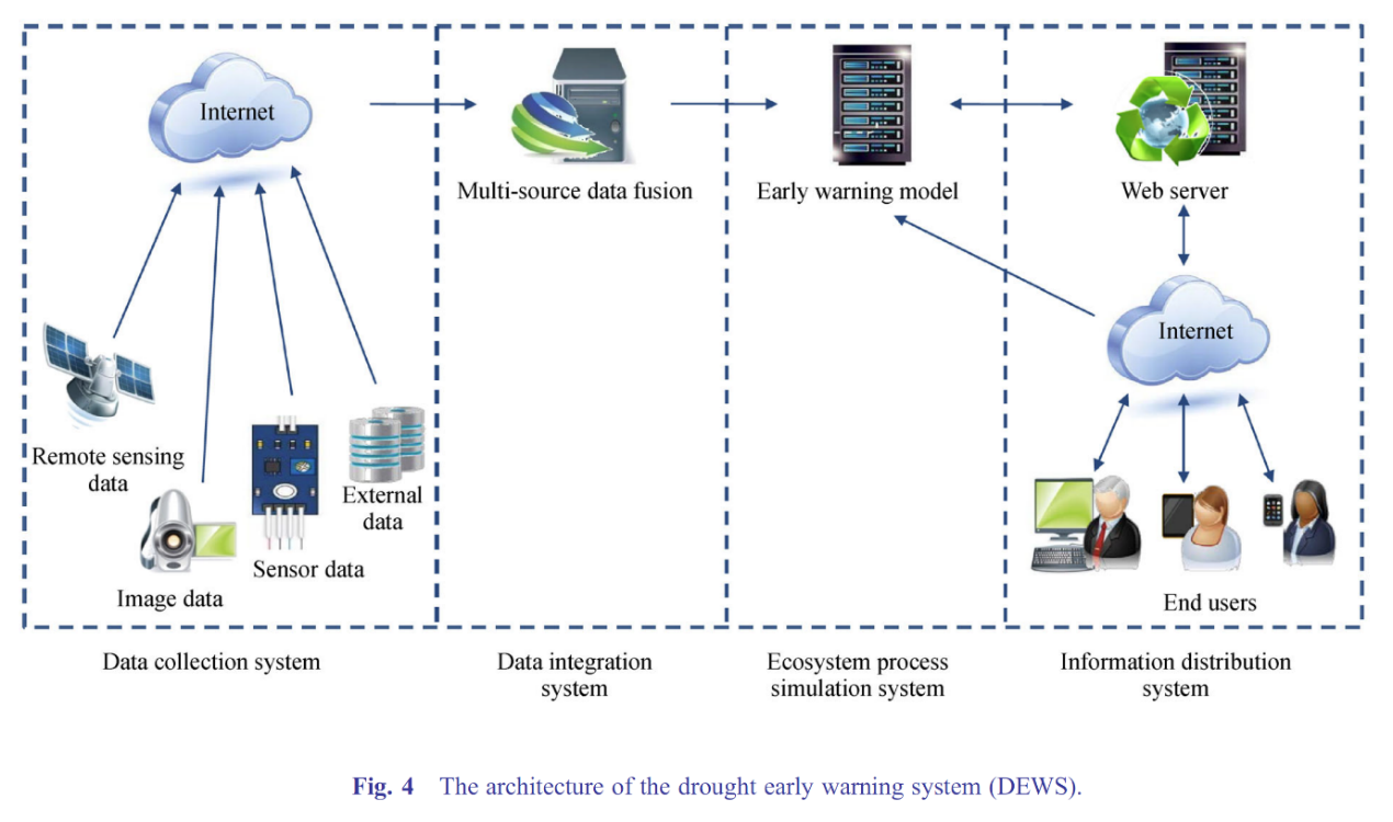 Les versions mobiles du logiciel d’alerte précoce à la sécheresse basées sur iPhone et iPad, adaptées aux pays africains, ont été publiées dans le projet. Les versions web du système d’alerte précoce à la sécheresse et la plateforme d’intégration des données d’alerte précoce à la sécheresse ont également été finalisées. La plateforme d’acquisition de données de capteurs a été préliminairement établie et les modèles de production agricole pour l’Éthiopie, la Zambie, le Maroc et le Niger préliminairement construits. Le système d’alerte précoce à la sécheresse a été préliminairement étendu et présenté au Maroc et en Éthiopie, et le logiciel a été vérifié en utilisant des données mesurées réelles lorsque le projet s’est terminé. Le DEWS sert deux types de clients, c’est-à-dire les clients mobiles et les clients de services web. Il utilise une architecture à quatre niveaux (Fig. 4). (1) Un système de surveillance écologique et de collecte de données soutenu par une base de données locale basée sur SIG et des données de capteurs écologiques ; (2) un système d’intégration de base de données qui peut assimiler des données multi-sources pour le système de simulation ; (3) un système de simulation des processus écosystémiques ; et (4) un système de distribution d’informations qui peut être accessible via des ordinateurs personnels et des appareils mobiles tels que les smartphones et les tablettes.