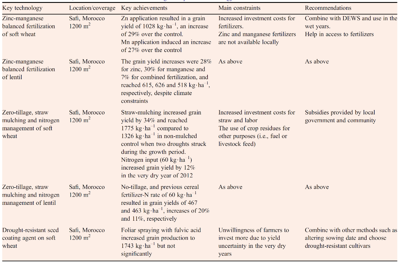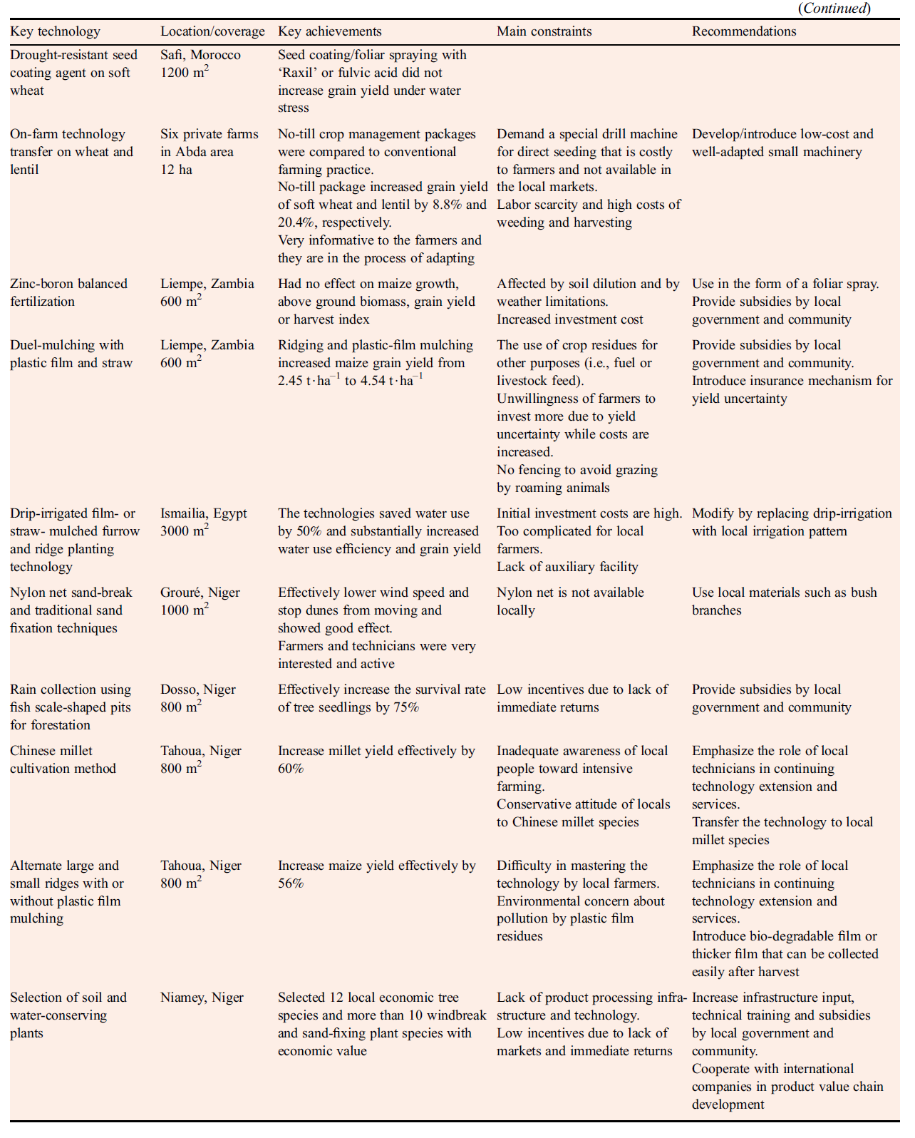 Avec les efforts conjoints des participants chinois et africains, des sites de démonstration de technologie d’adaptation à la sécheresse ont été établis et des essais sur le terrain organisés au Maroc, en Zambie, en Égypte et au Niger de 2011 à 2013. Le Centre de recherche agricole de Settat et le Centre de recherche agricole de Kénitra, l’Institut national de la recherche agronomique du Maroc (INRA, Maroc), le Département météorologique de Zambie ; le Collège des sciences agricoles de l’Université de Zambie ; l’Université du Canal de Suez d’Égypte et le ministère de l’Environnement et des Ressources en eau du Niger ont joué des rôles importants dans les essais. Les efforts fournis par les partenaires africains ont été essentiels pour le succès de la démonstration technologique et des essais sur le terrain car la plupart d’entre eux étaient très coopératifs et informatifs. Les techniciens et agriculteurs locaux ont montré un grand intérêt pour les démonstrations et les essais sur le terrain et ont participé à la formation pratique avec grand enthousiasme. À l’achèvement de l’expérimentation et de la démonstration, les chercheurs des universités et des institutions de recherche ont convenu de mener des études supplémentaires pour adapter les technologies à la situation de production locale. En plus de la formation pratique, des copies en anglais des spécifications opérationnelles des technologies d’adaptation à la sécheresse ont été préparées et distribuées aux partenaires africains pour assurer une application continue. Les technologies d’adaptation à la sécheresse testées, démontrées et étendues sont listées dans le Tableau suivant.