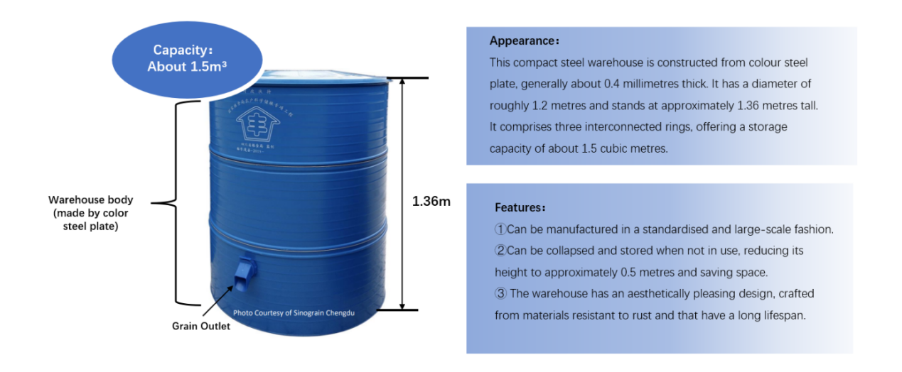 This compact steel warehouse is constructed from colour steel plate, generally about 0.4 millimetres thick. It has a diameter of roughly 1.2 metres and stands at approximately 1.36 metres tall. It comprises three interconnected rings, offering a storage capacity of about 1.5 cubic metres.