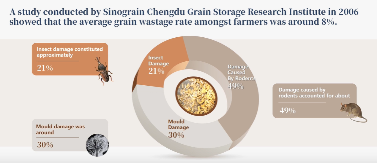 A study conducted by Sinograin Chengdu Grain Storage Research Institute in 2006 showed that the average grain wastage rate amongst farmers was around 8%.