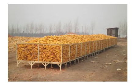Для урегулирования проблемы невозможности своевременно высушить свежесобранную кукурузу с высоким содержанием влаги, выращенную в некоторых районах Северо-Восточного Китая, и необходимости ее временного хранения был разработан модульный силос для краткосрочного хранения кукурузных початков с высоким содержанием влаги (так называемая «наземная силосная яма»). Силос такого типа состоит из нескольких стандартных ярусов размером 2 м × 2 м × 1,1 м, общей вместимостью около 35 куб. м. Он подходит для краткосрочного хранения (в течение 3 месяцев после сбора урожая) свежесобранных кукурузных початков с высоким содержанием влаги (содержание влаги ниже 30%), обеспечивая недорогое и безопасное краткосрочное хранение кукурузных початков. Боковые и нижние рамы силосной ямы изготовлены из стальных пластин толщиной 2,0 мм с размером ячейки 40 мм × 60 мм для обеспечения вентиляции и охлаждения. Главные характеристики такого хранилища: ① хорошая вентиляция, ② экономия времени и быстрая установка, ③ удобная погрузка и разгрузка зерна. Силосы такого типа активно применяются в Северо-Восточном Китае, и по состоянию на ноябрь 2016 года там использовалось уже более 20 490 таких хранилищ (Рис. 4).